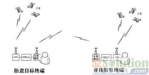 系统由防盗目标终端和寻找指引终端两部分组成,两个终端均分别在Spartan-3E开发板上实现,通过无线传输模块通信,另外加上GPS信号接收器接收卫星信号。