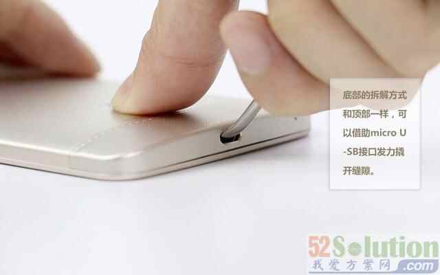 中兴AXON天机背部底部与顶部拆解一样,这里从Micro USB接口开启,如下图所示。