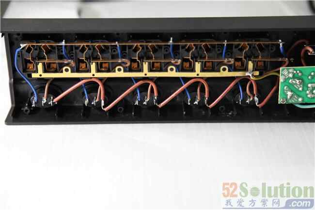 拆开后,因为插线是连在一起的,所以两个盒子分不开。自右向左,分别是过载保护复位开关、过载保护器、保护电路(背面有防雷指示灯)、一体式铜套。