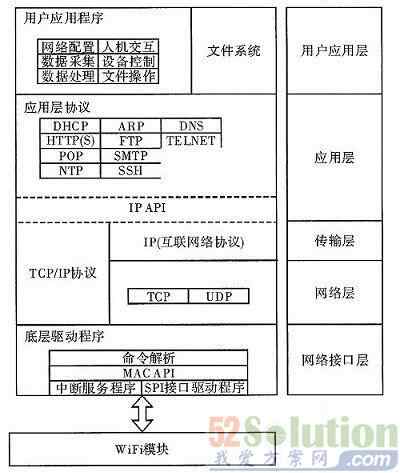系统软件部分,是在Microehip公司提供的TCP/IP协议栈和应用层Http协议基础上进行应用程序的设计与开发的。整个系统架构框图如图4所示,其中用户应用层的设计是本次设计的核心工作。