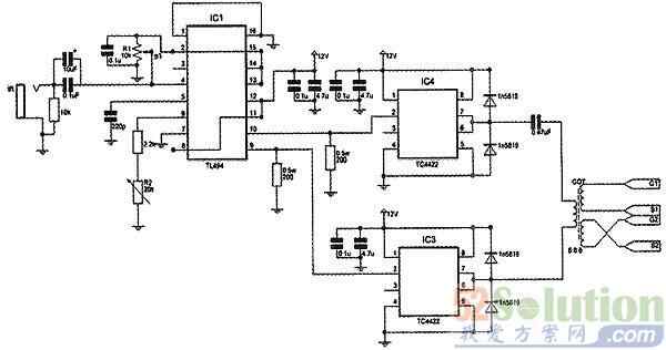 信号电路输出的脉冲信号还达不到使全桥MOS管正常启动的要求,需要一个驱动电路。此驱动电路与PWM控制电机驱动电路方法相同。电路采用TL494集成电路,其是一款固定频率的脉冲调制电路,包含了开关电源控制所需的全部功能。电路当中20k的可调电阻用来调节频率,10k电阻来调节电压幅值,在不接音频信号时可以做一款普通的驱动器R1,R9是9、10脚的下拉电阻。
