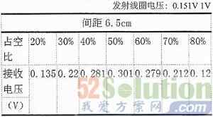 因为LC构成的发射、接收线圈固有频率为89KHz,在间距不变条件下,微小改变发射频率,通过示波器显示接收线圈感应电压最大在发射频率为90KHz 时,说明两线圈计算出的固有频率存在一定误差,当发射90KHz的脉冲矩形波时,调整占空比发生变化,相应的感应电压发生变化。从接收电压幅值变化规律可以得出接收到的信号频率发生变化,信号频率与两线圈固有频率存在差异,导致两线圈没有形成共振。