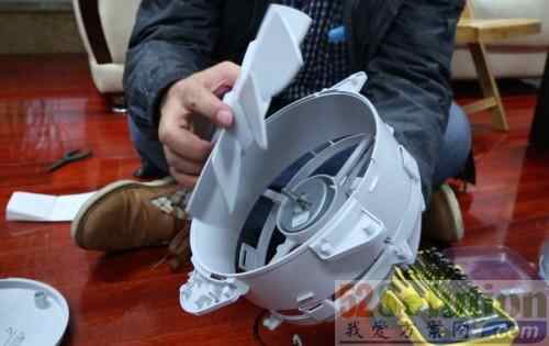 现在小米净化器2代就“脱去”了外衣,赤裸裸的暴露在我们面前了,我们将净化器头朝上,也是风扇的那面朝上放置过来,以便继续进行接下来的拆解工作