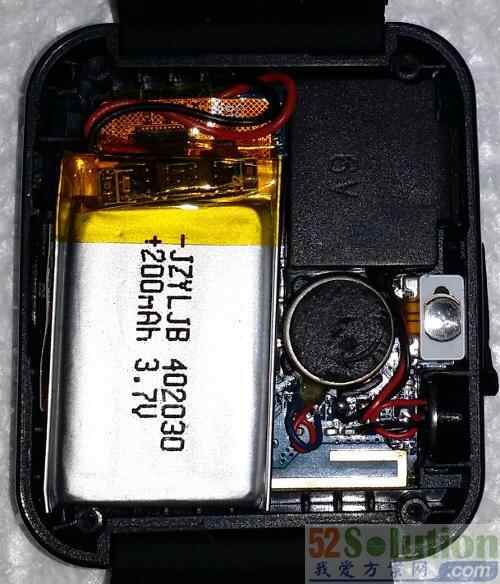拆开之后可以清楚看到内部构件:200毫安3.7V电池,重启按钮(右侧),底部应该是蓝牙天线。