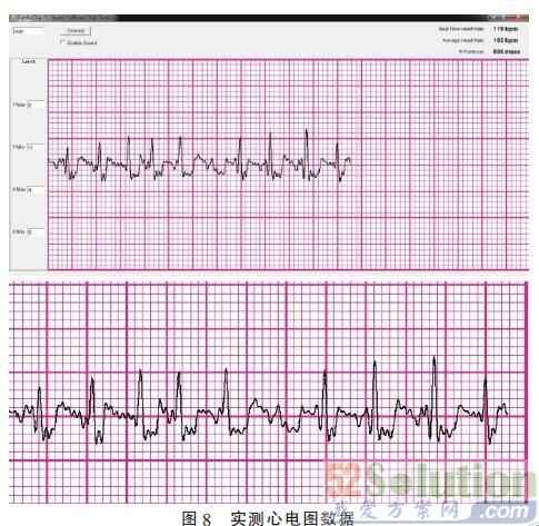 图8为本系统采集的一组心电图数据。通过比较分析可以得知,所测数据可以完整地显示心电图波形,基本功能已经实现。与正常心电图比较,各个波形的时间和幅度基本在典型值范围内。误差主要来自电极导线与皮肤之间的接触干扰。所测数据与医用动态心电仪测得数据比较,差别在于波形的平滑度,还需后期的滤波算法等技术处理。