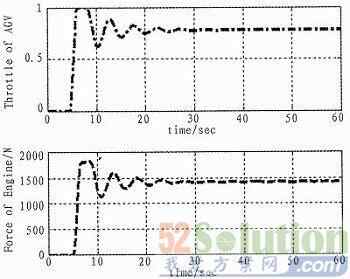 由仿真结果可知,巡航控制系统的效果是理想的。如果考虑了传感器的时延、作动器的时延,可以预计得到,此时的系统响应会出现滞后,性能会下降。具体的仿真结果见图4~5。在图4和图5中,时间延迟设定为0.5s,滞后的效果已经比较明显。如果时间延迟较大,而且每个子系统的时延还不一致的话,可以肯定地说,仿真的效果会更加恶化。