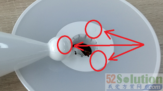 顶盖同灯体上部一样也有用盖板隐藏起来的螺丝钉,这里共有三个。拧下后可将图中所示的白色部分拆下,露出灯罩的三个螺丝。