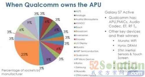 高通也在不遗余力地推广其射频技术,高通已经将目光投向了毫米波射频前端领域,毫米波在5G、汽车电子和其他应用的前景极好。与三星相比,当一部手机采用高通应用处理器时,芯片供应商更分散,其他厂商的机会也更多。在拆解的三星Galaxy S7 Active中,高通提供了应用处理器、电源管理芯片、音频芯片和射频接收芯片等。
