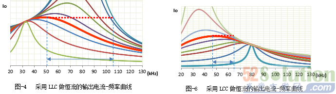 两图中虚线是恒流轨迹线,当负载电阻变化时,工作频率需要做相应的变化使得电流保持稳定不变,从图-4中可以看出,采用LLC拓扑实现恒流输出时,不同负载线之间的间隔较大,意味着频率变化较大。而从图-6中可以看出,采用LCC拓扑实现恒流输出时,不同负载线之间的间隔比较紧密,意味着频率变化较小。也就是说,LCC拓扑实现恒流时,频率随负载变化的范围比LLC的要小很多。