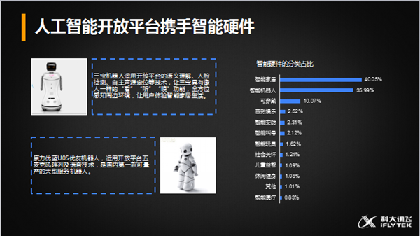 明星应用场景:三宝机器人。它运用开放平台的语义理解、人脸检测、自主声源定位等技术,让三宝具有像人一样的“看”“听”“嗅”功能,全方位感知周边环境,让用户体验智能家居生活。