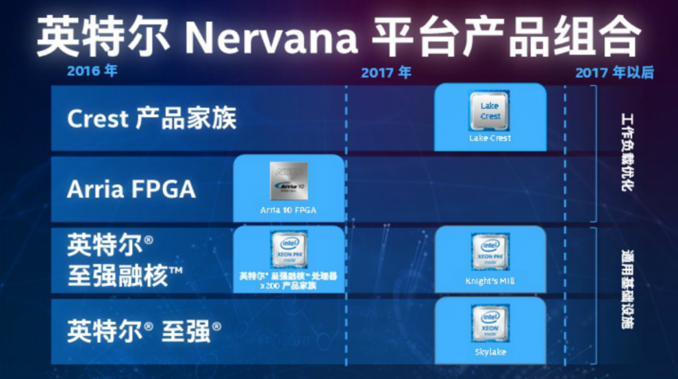 英特尔在这几次活动也揭露整合 Nervana 技术后的产品蓝图,除了首颗专用于深度学习运算的芯片 Lake Crest 将于 2017 年上半进行测试,Nervana 结合 Xeon、Xeon Phi 处理器的新品同样将在 2017 齐发。