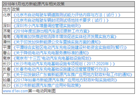2018年1月,国务院、科技部、发改委等部门出台了新能源汽车相关政策。北京、深圳、济南、海南、漳州、平潭、唐山、南京、长沙、广东、如皋、长春等12省市出台新能源汽车相关政策。其中北京出台了国内首个自动驾驶车辆封闭测试场地技术要求和车辆测试能力评估内容与方法。广东和长沙出台了2018年新能源汽车补贴政策。平潭、长沙、唐山、南京和长春出台了充电基础设施政策。