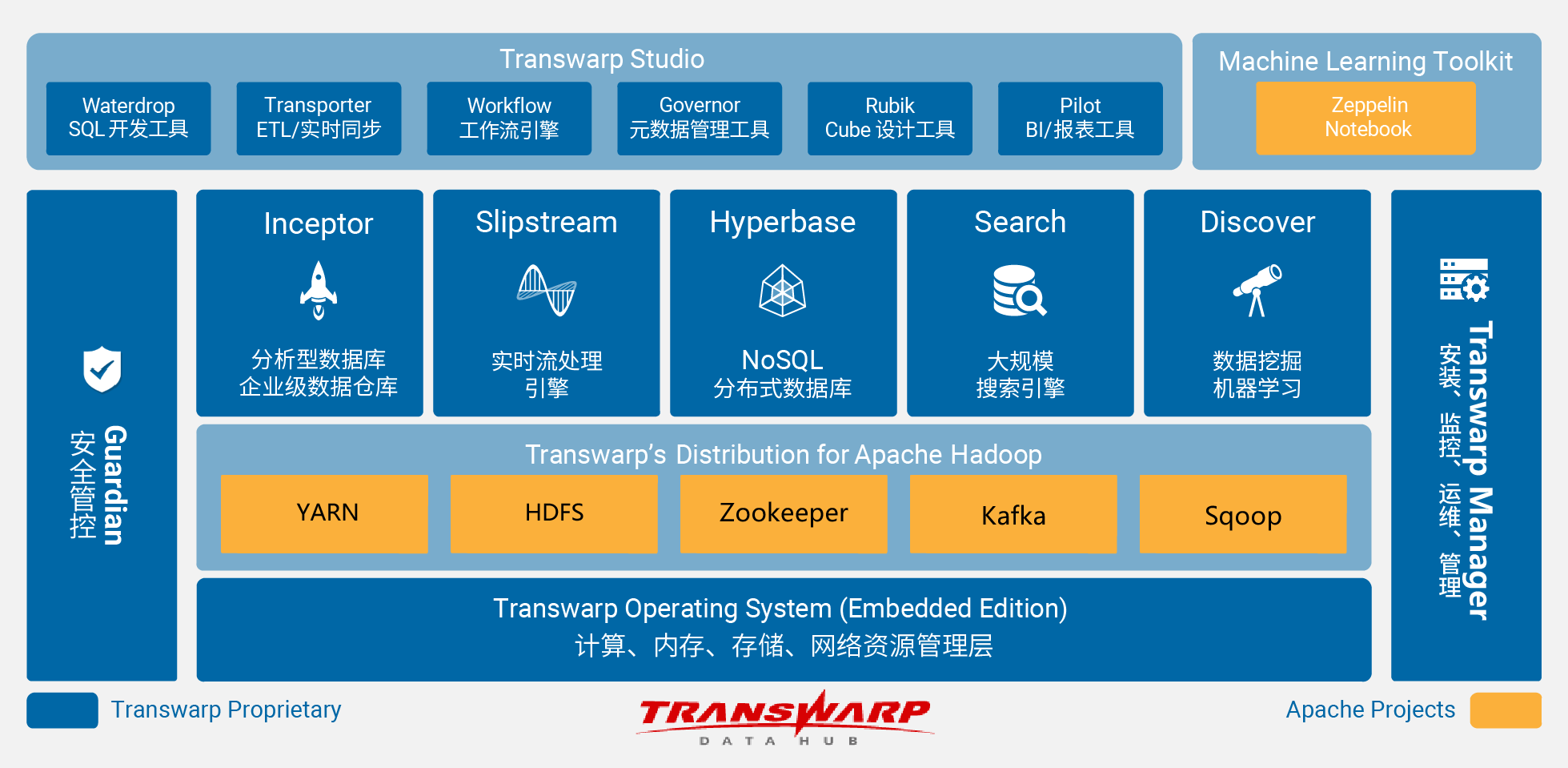 TDH由Apache Hadoop、5款核心产品、大数据开发工具集Studio、安全管控平台 Guardian和管理服务Manager构成;主要提供5款核心产品:Transwarp Inceptor是大数据分析数据库,Transwarp Slipstream是实时计算引擎,Transwarp Discover专注于利用机器学习从数据提中取价值内容,Transwarp Hyperbase用于处理非结构化数据, Transwarp Search用于构建企业搜索引擎。通过使用TDH,企业能够更有效的利用数据构建核心商业系统,加速商业创新。
