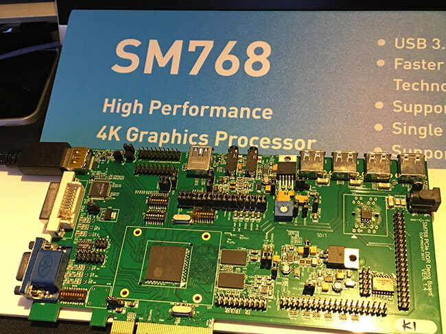慧荣最新的SM768图形显示芯片能支持4K的超高清(UHD),同时拥有USB及PCIe接口,并支持多屏幕应用,提供性能极佳的图形及影像显示解决方案。SM768图形显示芯片内建慧荣科技独家研发的内容自我调整技术 (Content Adaptive Technology,CAT),可降低CPU (中央处理器)20%~65%的使用率,不但解决嵌入式系统长期以来因绘图芯片资料过大,导致CPU负载过高拖慢整体系统效能的问题,同时也让显示效能大幅提升。SM768芯片本身的体积仅有19mm X 19mm,整体设备的体积设计可以更小、更易于携带,同时低耗电特色带来低热度系统,设计者可省去散热鳍片的成本与空间。