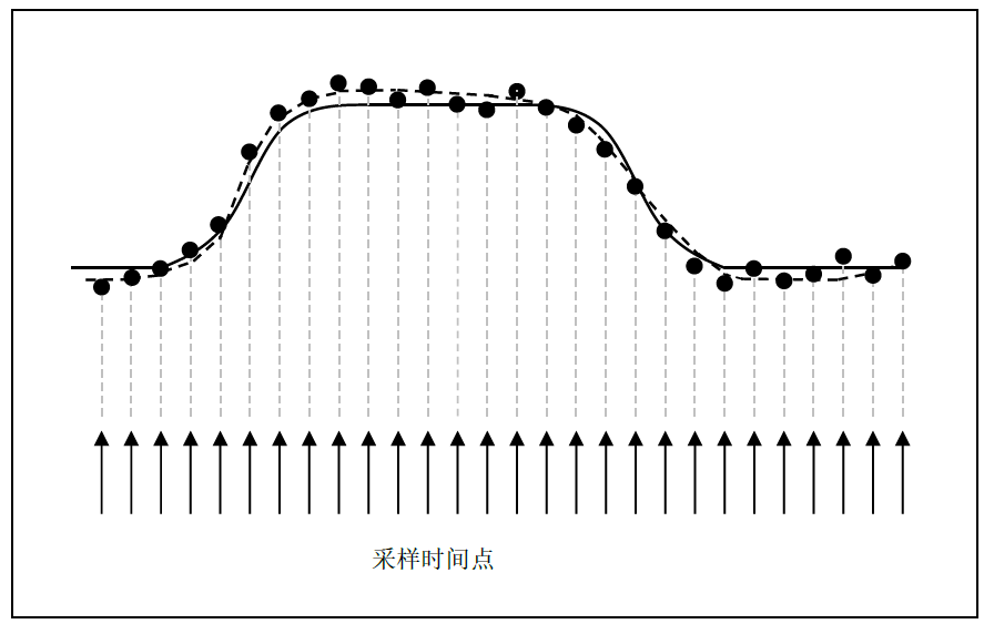 实时数字示波器使用内部时钟基准,以固定时间间隔对输入信号进行采样。采样速率可从 1 Gsps(每秒千兆样本)到用于高性能设备的 40 Gsps。图 10 所示为实时数字示波器采样其输入端的信号并加以显示的方式。该图最下方的箭头代表采样时间点,实线代表实际信号,虚线上的圆点代表采样值。示波器(以虚线表示)显示的信号是对采样值圆点的最佳拟合曲线。
