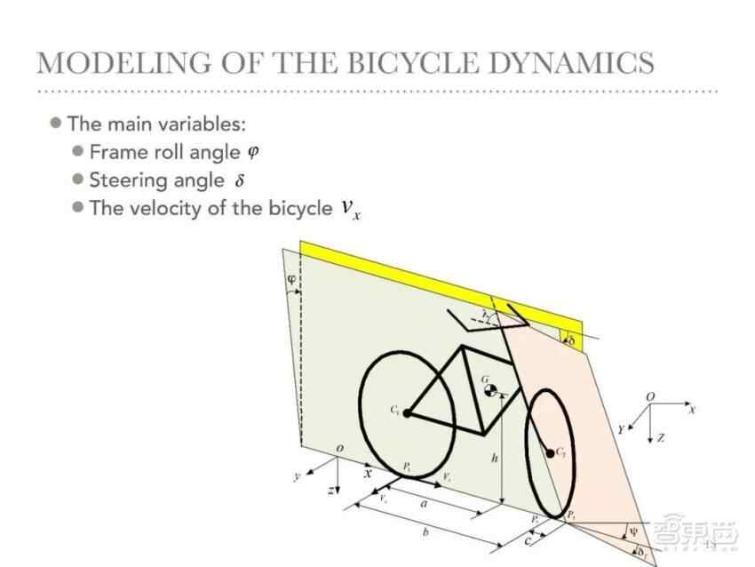 这是一个已经做了简化的动力学方程,去掉了若干影响比较小的项。我画圈的很多项的系数都和速度相关,变速行驶时模型参数会发生很大变化,就不是那么好控制,我们科普自行车原理的时候就只保留最主要的那几项,实际上也就可以实现匀速的控制了。