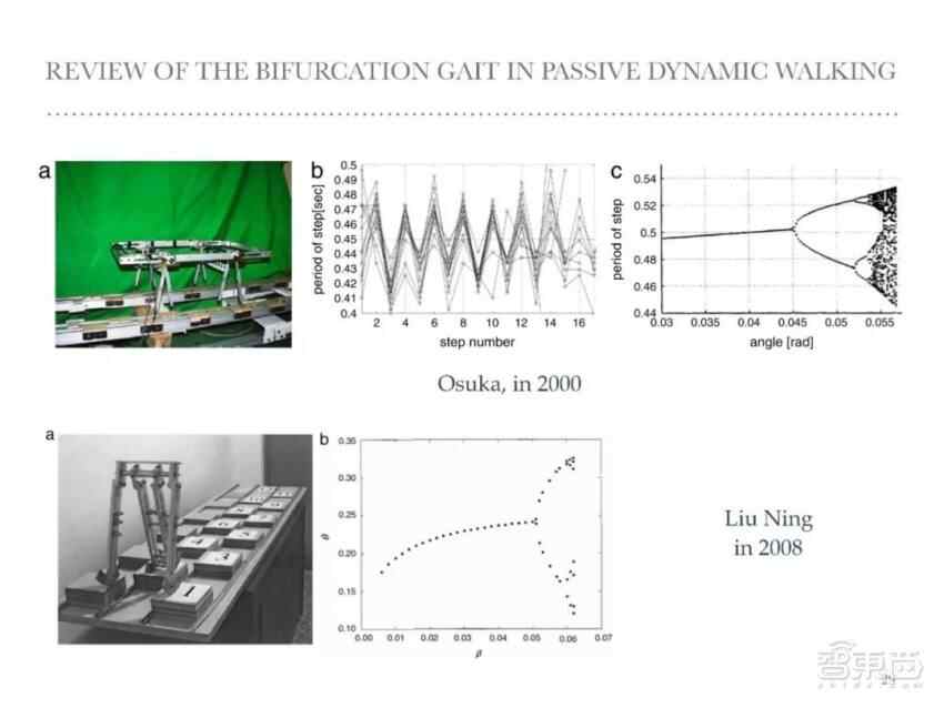 计算是用李亚普洛夫指数来算的,根据李亚普洛夫指数的大小来判断它是不是混沌,随着年龄不同也会不同,几乎最后测出来都是认可混沌的。医学研究人员提出来这个结果,用了5、6个人,每个人走二十几步,拿这个数据说这个是混沌步态,这个不是混沌步态是帕金森症的步态,那个是什么,在工科人看来量不够,所以我们希望数据能更多一点。在我们做的小机器人上也观测到这个现象,导致我们产生了别的想法,人走路是混沌的,还是单周期,应该用哪个模型?现在所有方法都是单周期的,都是按照单周期来做的。只有一个似乎是例外,美国比较火的混合零动态( HZD)方法,本质上用了很多单周期步态在切换。