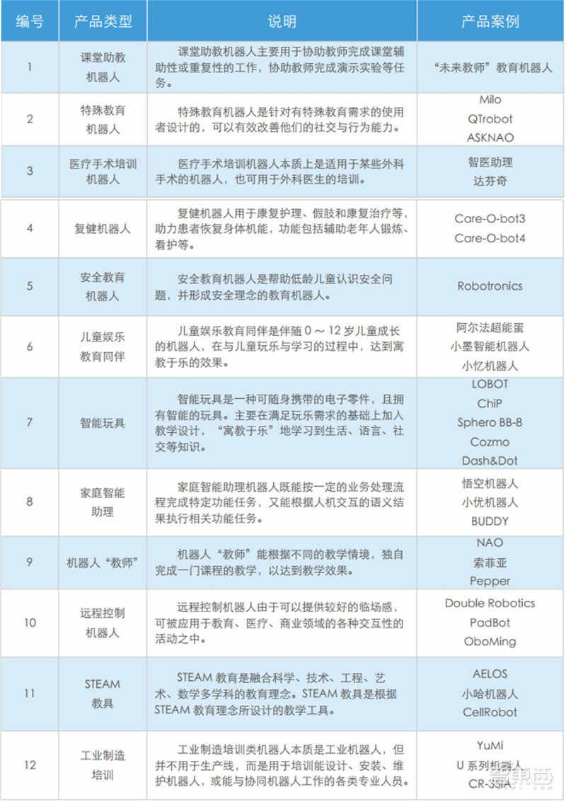 教育服务机器人(Educational Service Robots)是具有教与学智能的服务机器人,通常被用于进行 STEAM教育、语言学习、特殊人群学习等主题的辅助与管理教学中。区别于机器人教育中常见的产品,教育服务机器人具有固定的结构,一般不支持用户自行拆装。 近年来,在世界各国纷纷颁布机器人和人工智能战略部署的背景下,将人工智能技术和机器人运用于教育领域的实践探索越来越多。教育机器人作为机器人应用于教育领域的代表,将成为智慧学习环境的重要组成部分。
