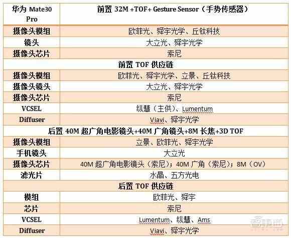 ▲华为Mate 30 Pro中的TOF方案供应链情况(图源“摄像头观察”)