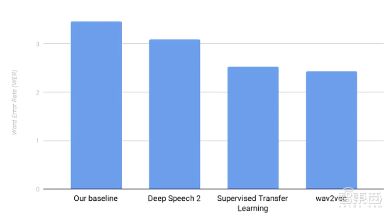 训练结果令人印象深刻。在Deep Speech 2上,Facebook基于wav2vec的模型实现了2.43%的单词错误率,而普通系统使用12,000小时(超过150倍)的转录数据训练后的单词错误率为3.1%,相比之下,wav2vec的错误率降低了22%。wav2vec训练的模型与缺少预训练的模型相比,单词错误率还可以提升30%。