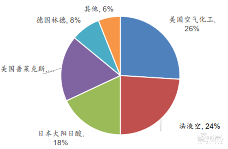 由于技术壁垒高、制备难度大,目前全球电子特气市场被几家海外龙头企业垄断。主要公司有美国空气化工产品公司、法国液化空气集团、日本大阳日酸株式会社、美国普莱克斯公司、德国林德集团(2018年与美国普莱克斯公司合并)等,合计占据全球市场 94%的份额。中国的电子特气市场中,外资巨头也牢牢控制了 85%的市场份额,进口替代需求强烈。