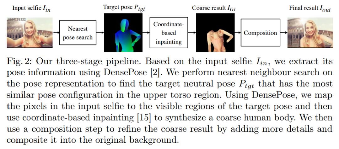首先在数据库中搜索最相近的他拍姿势,然后执行基于坐标的身体纹理修补,最后使用合成模块来细化结果,并在背景上合成它们。