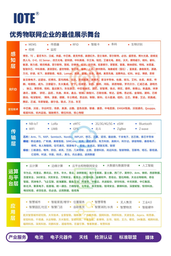 3、完整产业链,采购更容易。涵盖物联网感知层、网络传输层、运算与平台层、应用层。还有以应用集成导向的同期展,聚焦:5G、新基建、智慧城市、工业物联网、等物联网核心应用,一站式展示物联网产业最新技术、产品、方案、企业。