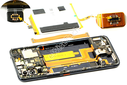 主副板连接排线1断开连接即可取下,电池通过则通过便于拆解的易拉把手固定。而由于使用的是44W快充,所以电池通过两根排线来实现44W快充,分别与主板和副板连接。