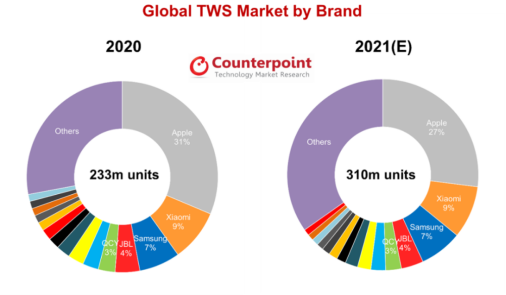 图2:TWS耳机各品牌的市场占有率(图源:Counterpoint)