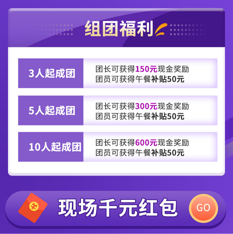 10人起成团,团长可获得600元现金奖励,团员可获得午餐补贴50元。