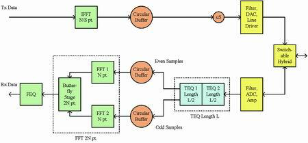 请注意,针对长环路进行优化的调制解调器的两条路径相结合,就构成了TEQ与FFT操作