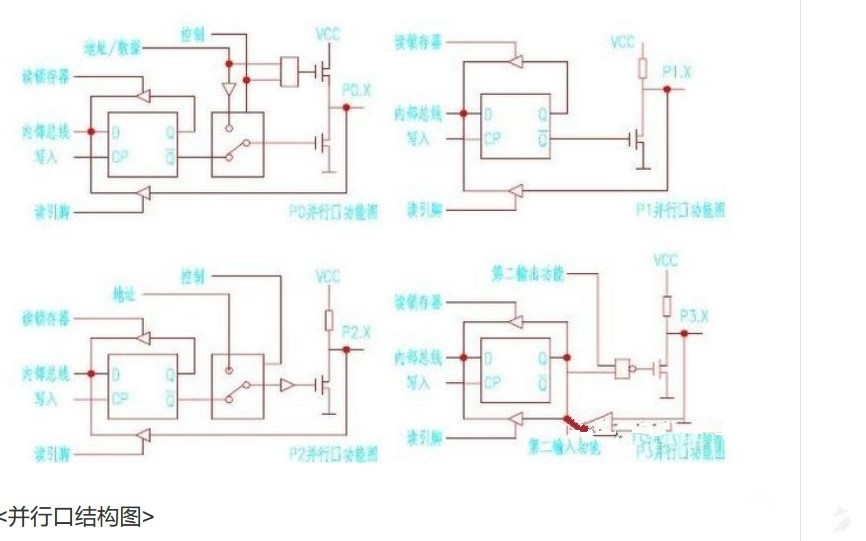 以上是P1口的一位的结构,P1口其它各位的结构与之相同,而其它三个口:P0、P2、P3则除入作为输入输出口之外还有其它用途,所以结构要稍复杂一些,但其用于输入、输出的结构是相同的。看图示。对我们来说,这些附加的功能不必由我们来控制,所以我们就不去关心它了。