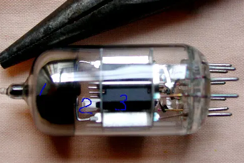 现在日常用的多半是这种电子管.由阴极发射出来的电子穿过栅极金属丝间的空隙而达到阳极,由于栅极比阳极离阴极近得多,因而改变栅极电位对阳极电流的影响比改变阳极电压时大得多,这就是三极管的放大作用.换句话说就是栅极电压对阳极电流的控制作用.我们用一个参数称跨导(S)来表示.另外还有一个参数μ来描述电子管的放大系数,它的意义是说明了栅极电压控制阳流的能力比阳极电压对阳流的作用大多少倍。