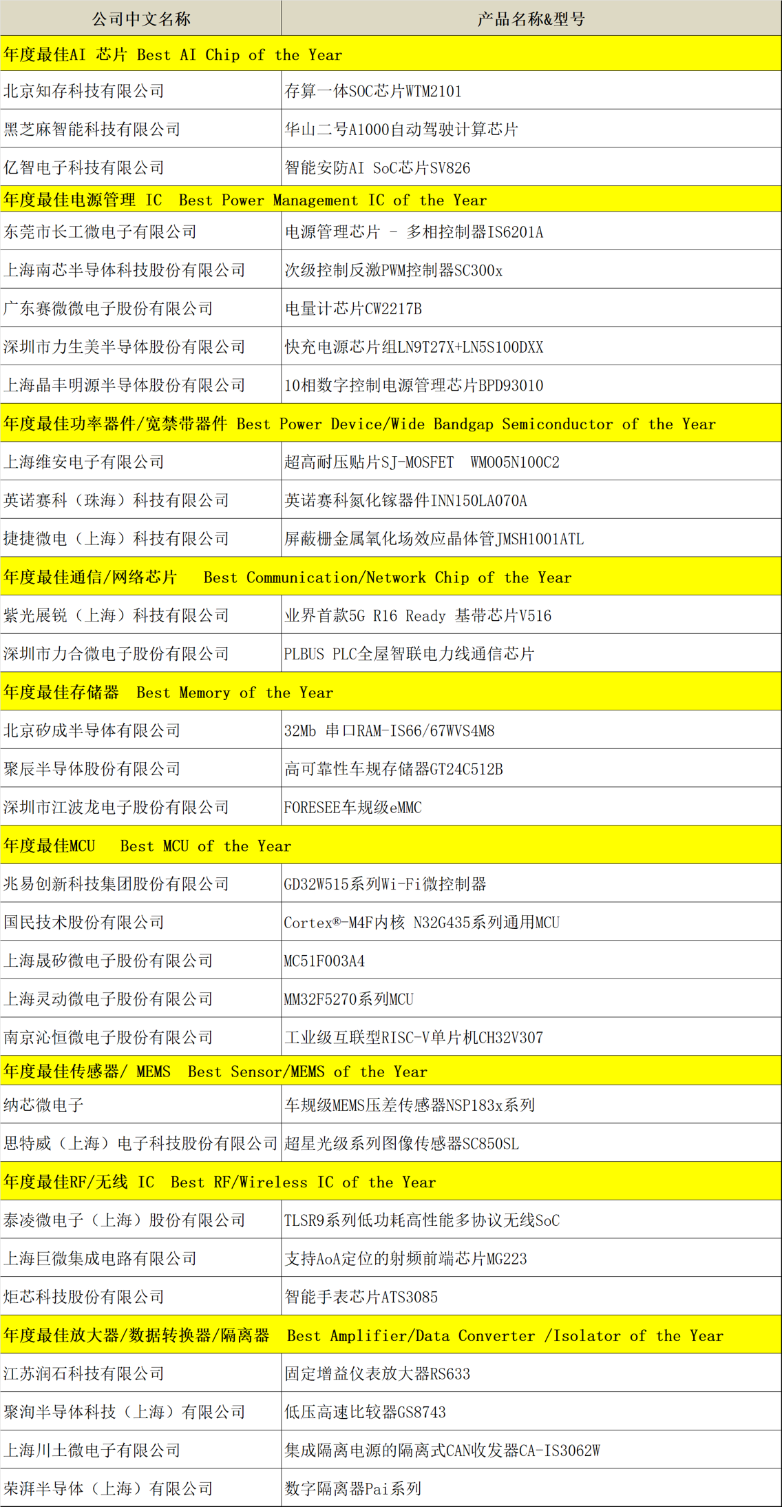 “2022年度中国 IC 设计成就奖”的获奖者由AspenCore社群中电子和IC设计工程师,以及AspenCore分析师团队投票产生。获奖名单如下 (奖项及得奖者排名不分先后):