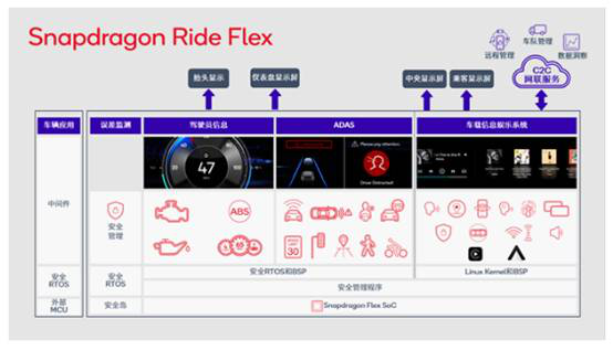• Snapdragon Ride Flex SoC支持混合关键级工作负载,可基于同一硬件协同部署数字座舱、ADAS和自动驾驶(AD)功能
