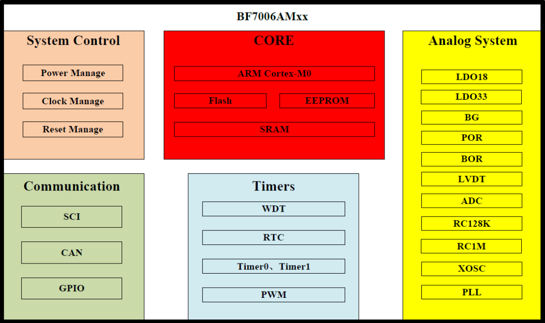 BF7006AMXX 作为一款满足汽车AECQ100 GRADE1 品质等级的32 位通用MCU,依照ISO26262 ASIL-B 等级标准要求设计;其内部集成CAN、LIN、UART 等多种通信模块,多路计数器、计时器及PWM 功能,并包含有高精度ADC,存储支持EEPROM 即时数据保存等多种通用模块。封装形式为LQFP64、LQFP48、TSSOP28,适合如电动车窗、电动座椅、雨刮、车灯、门锁等多种汽车电子车身控制应用。