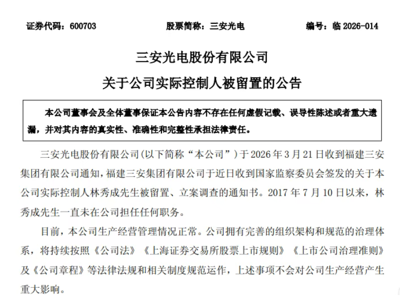 三安光电实际控制人林秀成已被国家监察委员会立案调查并采取留置措施