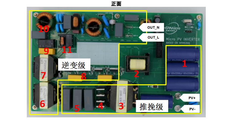 该demo为基于HPM5361IEG1的推挽谐振微型逆变器方案。采用两级变换结构, 前级为推挽DC-DC变换器,把PV电压转换为直流母线电压,供后级逆变使用。后级 为DC-AC逆变器,将直流电能变换为所需的交流电能。