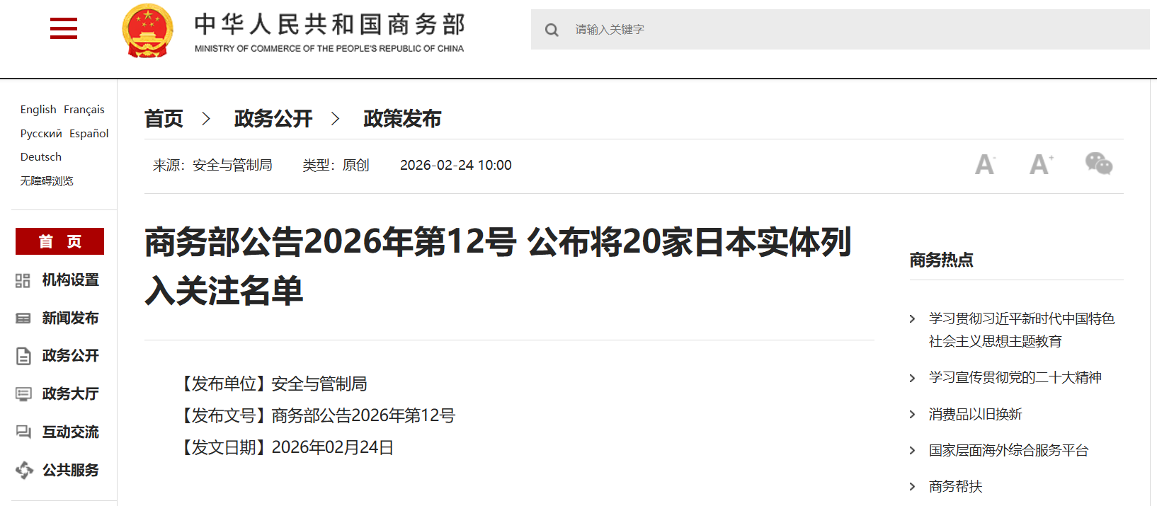 商务部2月24日发布公告,根据相关法律法规,决定将斯巴鲁株式会社、三菱重工等 20 家无法核实两用物项最终用户和最终用途的日本实体列入关注名单。