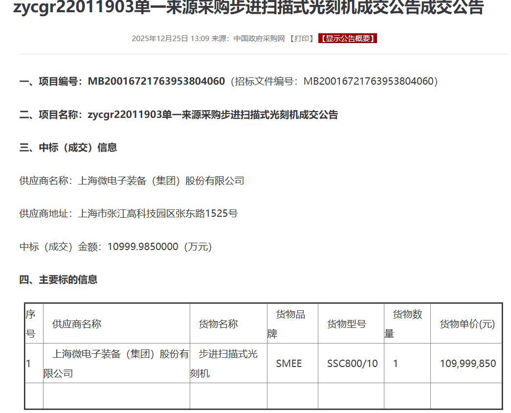 上海微电子中标zycgr22011903采购步进扫描式光刻机项目,成交金额约1.1亿元!
