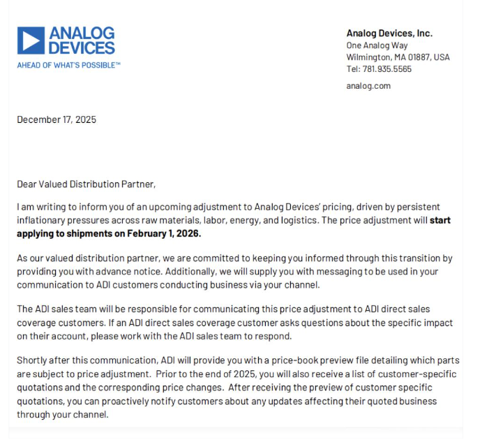 ADI宣布涨价,幅度约15%,部分军规级产品涨幅高达30%!