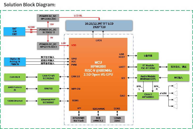 方案优势 快速开机:冷启动小于100ms,并于500ms内显示第一屏内容。 最高1920*1080 分辨率,实现最高60fps的指针刷新,30fps的路况信息刷新。 支持视频输入,可实现倒车视频,中控互联交互功能。 商业级HMI图形软件,所见即所得,提高开发效率。 量产级底层SDK软件包和中间件,可选适配完成的UDS软件协议栈。 支持OTA升级。 提供一站式服务合作模式:含仪表方案开发板、核心板、专业的汽车仪表开发团队技术支持,具备实现Turnkey 交付的能力。 方案框图 方案采用先楫半导体推出新一代数字仪表显示及人机界面系统(HMI)应用平台——HPM6800系列。该系列产品主频600MHz RISC-V CPU内核,支持双精度浮点运算及强大的DSP扩展,算力1710DMIPS,支持扩展内存DDR2-800,DDR3/DDR3L-1333,配备2.5D OpenVG GPU,MIPI、LVDS双屏显示接口及双摄接口,单芯片MCU开发简便,启动时间低至百毫秒,系统功耗低,可应用于数字仪表显示和人机界面领域。 HPM6800系列秉承先楫高性能芯片一贯的强大算力、精准控制、卓越通讯等特点,并聚焦于将高效的图形处理、复杂的人机界面及实时的信号控制三项功能融合并集成一体,最大限度地发挥系统效能。搭载HPM6800高性能MCU的多媒体系统解决方案在工业HMI、汽车仪表以及更广阔的市场领域的应用落地。 应用场景: 先楫HPM6800系列集高算力、低功耗、高集成度和出色多媒体能力等特点,是一款特别适合于带复杂图形图像处理、数字仪表显示、高性能多媒体用户界面应用的新一代应用平台。其中,HPM6800高度集成的特性,无需电源管理子系统,有助于降低系统成本。适合以下目标应用,但不仅限于这些应用: 汽车仪表/摩托车仪表/工程车仪表 人机交互界面(HMI) 电子后视镜(CMS) 车身域控(ECU) 车载通信终端(TBOX) 网关(Gateway) 智能管理系统平台 视觉/语音辅助产品 工业相机 高端医疗设备 产品性能: 主频 600MHz RISC-V CPU内核 片上内存1MB 支持扩展内存 DDR2-800,DDR3/DDR3L-1333 17×17 417 BGA P0.8 封装 −40°C 至 +105°C 工作环境温度 增强图像系统: 2.5D OpenVG 1.1 GPU 2组 4 Lane MIPI-DSI/LVDS-Tx 显示接口 2组 2 Lane MIPI-CSI/LVDS-Rx 摄像头接口 2D 图形加速 LCD控制器支持 8图层 Alpha-blending 1920 × 1080 分辨率显示屏刷新率可达 60fps 集成 JPEG 编解码器可实现快速 JPEG 编码和解码,减轻处理器负荷 音频: 4个 8通道全双工I2S 和 1个数字音频输出 多路语音和数字麦克风接口 外设: 1个内置PHY的高速USB,千兆以太网口,多达 8路 CAN/CAN-FD及丰富的UART、SPI、I2C等外设 1个 2MSPS 16 位高精度 ADC,配置为 12位精度时转换率可达 4MSPS 多达 36路32位定时器,3个看门狗和 RTCHPM6800数字仪表方案