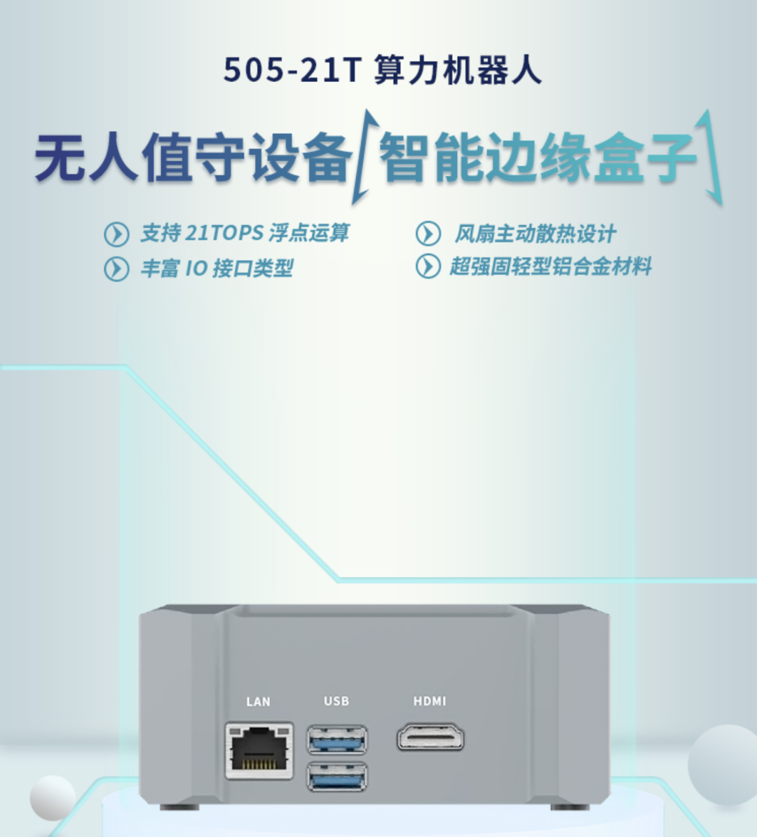 ISG-503 是一个用于电信/工业设备链接的智能网关,适用做边缘计算,运行容器化部署。它采用RK3288 64位CPU,工业级宽温设计,支持壁挂安装,导轨安装,外部 RS232、RS485、DI、DO 等多种接口,支持 4G、5G 通讯、 用户可在复杂环境下使用。 瑞芯微RK3399 PRO 智慧零售多功能边缘计算盒子,适用于边缘计算,广告机,miniPC整机,工控一体机,零售机和快递柜。支持Rockchip RK3399pro处理器;板载2GB(CPU)LPDDR4内存,最大可支持4GB板载2GB,DDR4内存最大可支持4GB。高性能,稳定性强,土安安综合测试10万分,性能优越。 这是一款具备21T算力机器人无人值守设备智能边缘盒子是一款基于NVIDIA® Jetson Xavier NX系列模块设计的计算平台,内置集成Xavier NX模块,预装 Ubuntu 18.04 操作系统,具备21TOPS浮点运算的AI处理能力,采用超强固轻型铝合金材料设计,风扇主动散热,尺寸轻巧外观新颖,丰富IO接口类型,预留便于现场安装的底部支架,具备超长MTBF稳定运行能力,可应用于机器人、无人配送车、低空防御、智能巡检、智慧楼宇等自主化机器,是边缘端部署 AI 算力进行深度学习的理想载体。 21T算力5G智能巡检边缘计算盒子为一款基于NVIDIA® Jetson Xavier NX系列模块设计的计算平台,内置集成Xavier NX模块,预装 Ubuntu 18.04 操作系统,具备21TOPS浮点运算的AI处理能力,支持4G/5G功能,超强固轻型铝合金材料设计,无风扇结构传导被动散热,尺寸轻巧外观新颖,丰富IO接口类型,预留便于现场安装的底部支架,具备超长MTBF稳定运行能力,可应用于机器人、无人配送车、低空防御、智能巡检、智慧楼宇等自主化机器,是边缘端部署AI算力进行深度学习的理想载体。