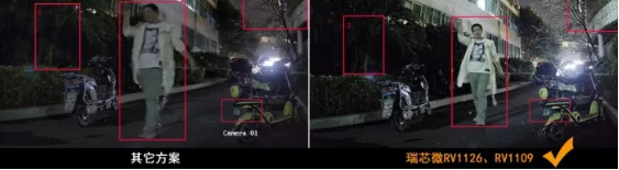 基于瑞芯微RV1109和RV1126芯片开发的 AI视觉主板方案对比传统的安防监控产品,能有效解决黑光全彩拖影少、逆光强光、显示清晰、还原度高和亮度高的问题。举个案例,夜晚微光环境下,使用其它方案设备的画面呈现并不理想,出现拖影、逆光、画面暗淡和人脸显示不清晰等,使用瑞芯微RV1109和RV1126AI视觉主板的设备,呈现的画面中行人挥手走动无拖影,画面显示清晰,暗处噪点极低,且逆光无明显溢出。