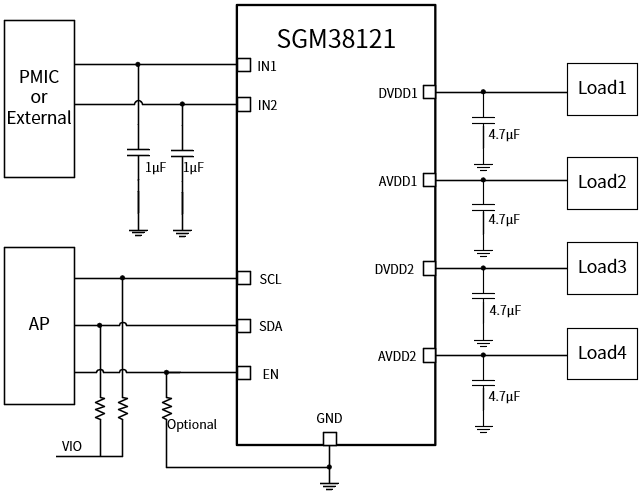 SGM38121集成了 2 路低压差 DVDD,2 路高 PSRR AVDD,为不同型号、不同输入电源的摄像头提供稳定、可调、可靠的多路电源支持,保障拍摄的清晰度和稳定性。