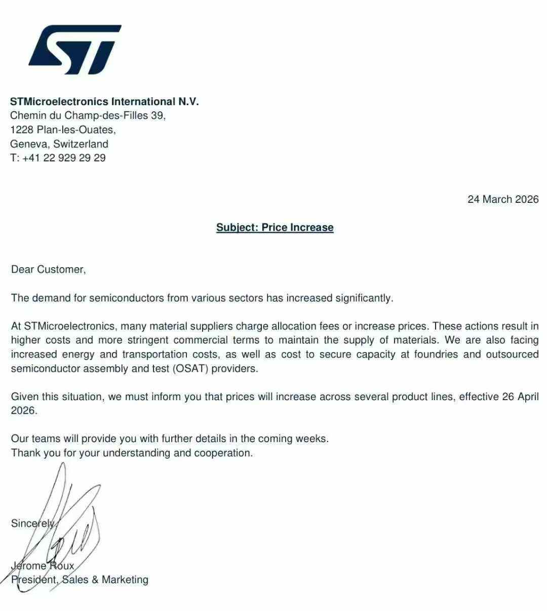 意法半导体将自4月26日起对多个产品线实施价格上调
