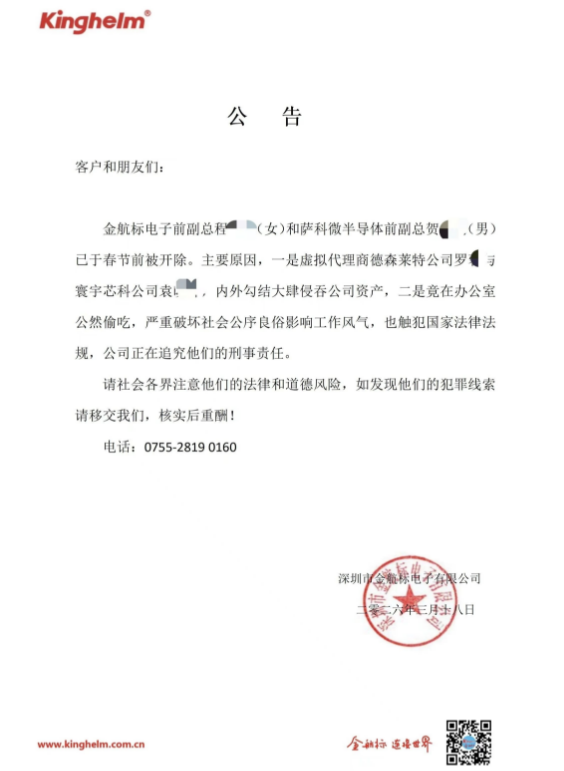 金航标电子发布公告称,公司前副总程某某(女)和萨科微半导体前副总贺某某(男)已于春节前被开除。