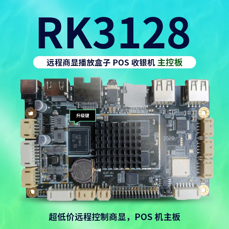 RK3128 远程商显播放盒子POS收银机主控板(产品型号GL311),适合远程控制远端设备,包括触摸型工业设备,商显广告机和POS收银机等。为节省成本,该方案只有WIFI和蓝牙联网,没有配置4G,所以较适合室内设备应用。它采用低成本瑞芯微四核芯片 RK3128 方案,主频 1.3GHz,但性能支持常用外接设备接口,灵活性人机界面,由于出货量大,性能稳定,价格低于同行水平。