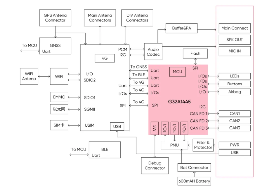 方案以极海G32A1445作为主控MCU控制整个方案板的联动,通过CAN总线与BCM及其它ECU 连接,同时使用 UART与4G模块/BLE/定位芯片通信。G32A1445接收到BCM发来的控制命令并进行解析,通过CAN采集车辆数据状态,把数据实时上传后台监控,保证车辆的安全运行。在电源部分,该方案采用两套电源通路为整个微控制系统供电,一路由车机供电,一路由600mA·H池供电;G32A1445通过SPI接口外挂一个EEPROM存储必要的参数。在通信部分,G32A1445通过UART把CAN接口获取到的信息传输给4G模块/BLE,实现数据实时上传。