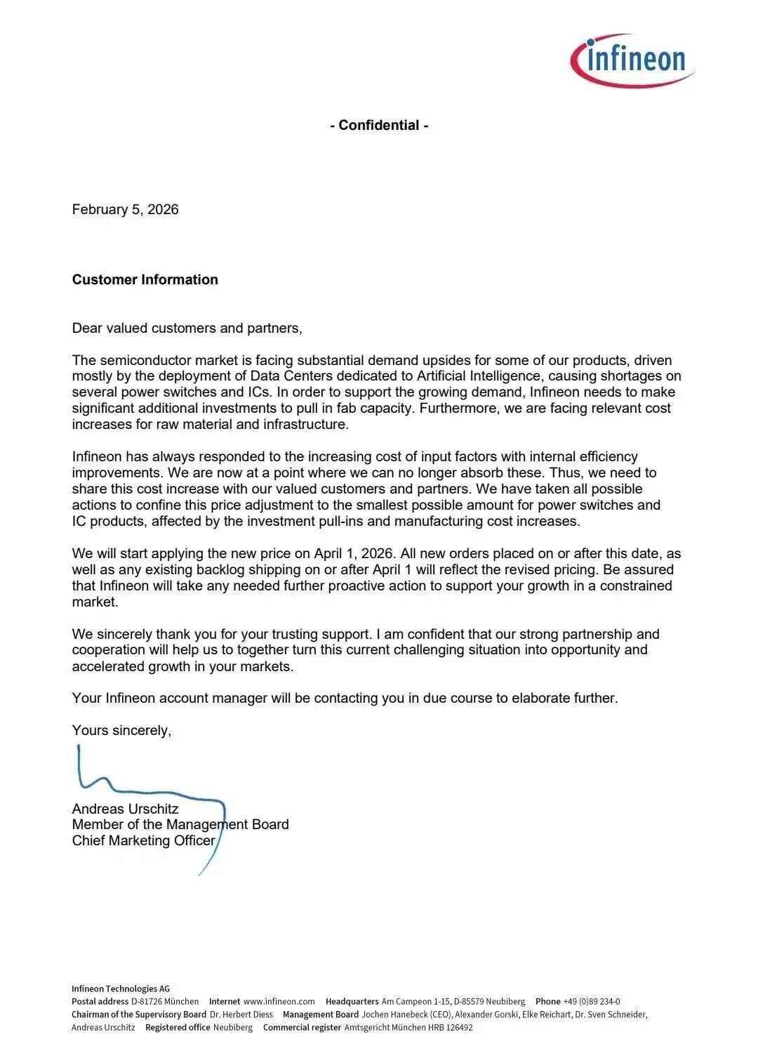 全球领先的功率半导体制造商英飞凌(Infineon)正式向客户发出调价通知,宣布新价格将于2026年4月1日起全面生效。